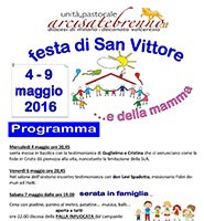 L’Unità Pastorale ArcisateBrenno organizza i festeggiamenti del Patrono San Vittore con un vasto programma di eventi dal 04 al 09 Maggio 2016. Maggiori informazioni e dettagli nel volantino Altre informazioni e iscrizione al pranzo sul sito http://www.arcisatebrenno.it/