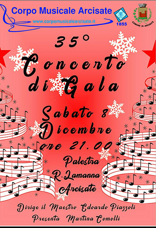 Il corpo musicale di Arcisate in collaborazione con il Comune di Arcisate vi invita a partecipare al prossimo concerto di Gala che si terrà il prossimo sabato 8 dicembre presso la palestra R.Lamanna di Arcisate.