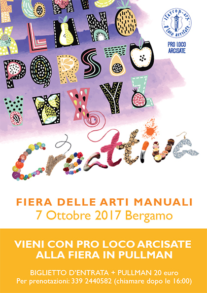Creattiva con Pro Loco Arcisate Evento del 7 Ottobre 2017 In Gite Pro Loco di Arcisate organizza il 7 Ottobre 2017 la gita alla fiera di riferimento per le arti manuali – CREATTIVA – che si terrà a Bergamo. Pullman + entrata 20 euro. Per prenotazioni contattare il seguente numero dopo le 16:00 339.2440582 Related Posts Creattiva, fiera delle arti manuali Visita alla città di Vicenza Creattiva: fiera delle arti manuali Grotta Remeron