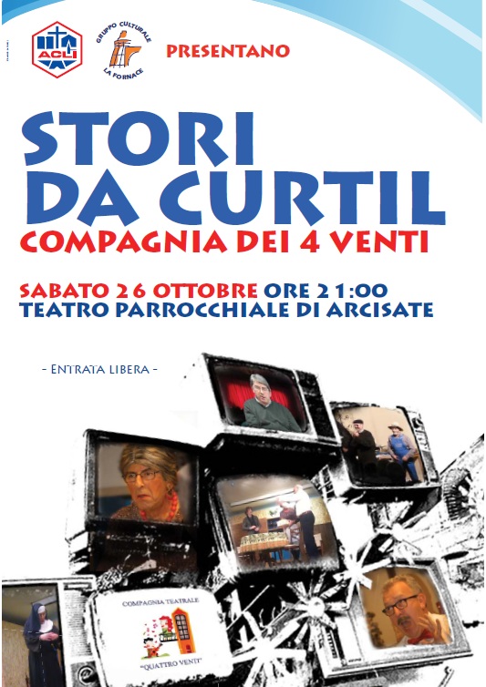 La Compagnia dei 4 Venti sarà presente sabato 26 Ottobre presso il teatro parrochiale di Arcisate per regalarci una lieta serata. La serata è organizzata dal Gruppo culturale La Fornace delle Acli di Arcisate.